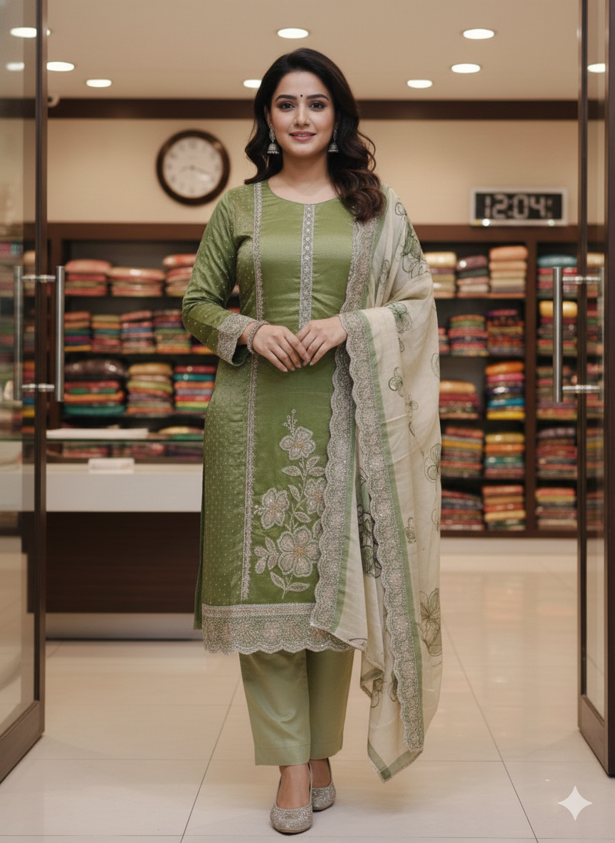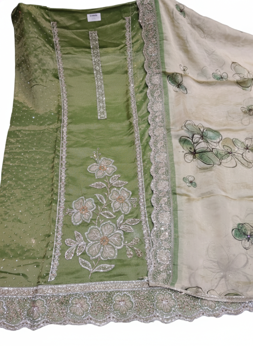 Top : Heavy zircon and floral Printed Unstitched Shimmer Fabric Suit