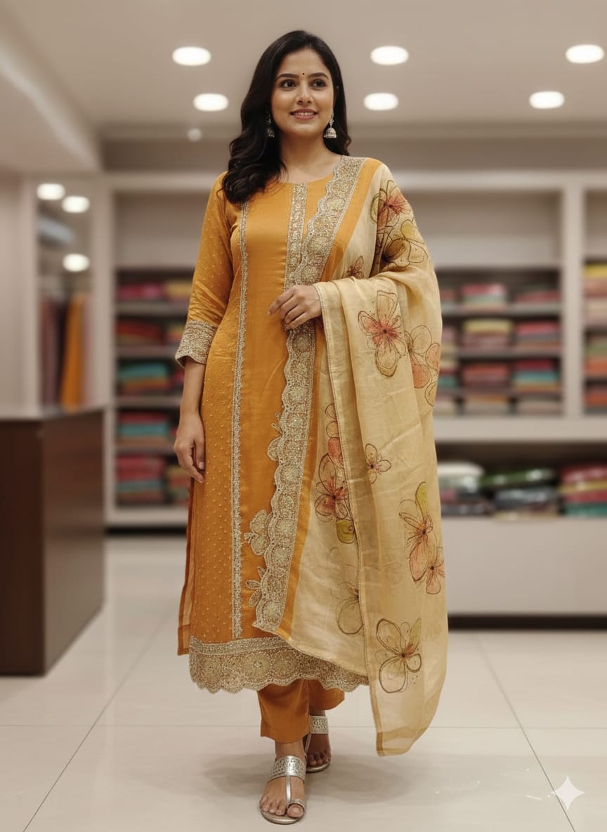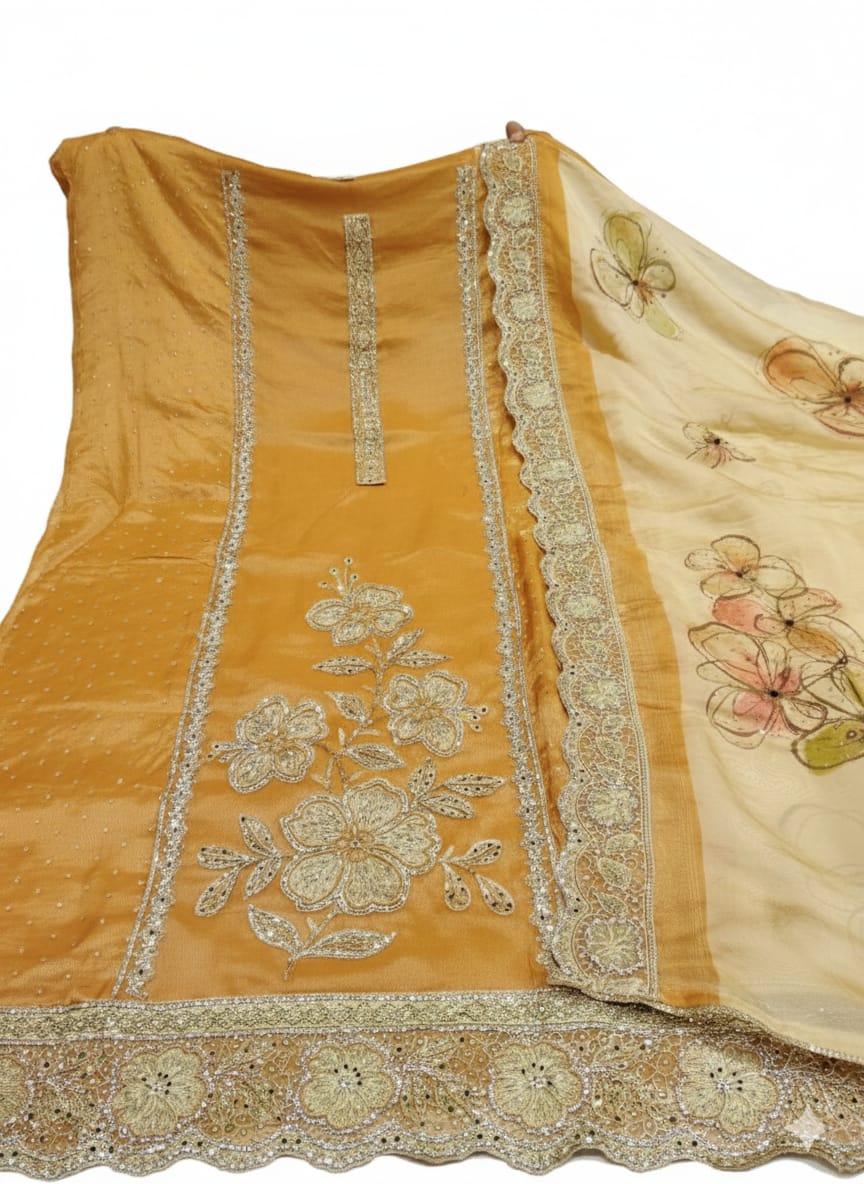 Top : Heavy zircon and floral Printed Unstitched Shimmer Fabric Suit