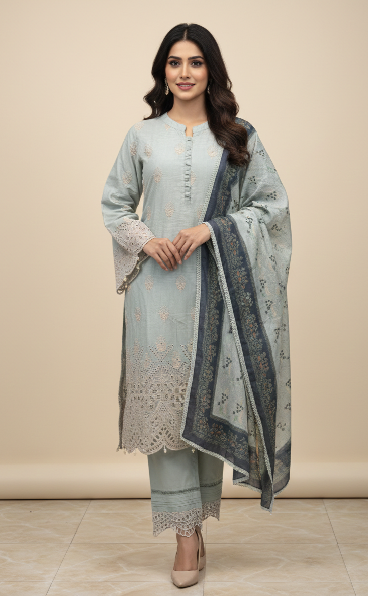 Top : Neckline and sleeves with cutwork on Maslin fabric